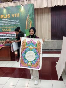Dalam cabang Kaligrafi Golongan Mushaf Putri, peserta dituntut tidak hanya memiliki ketepatan dalam penulisan ayat Al-Qur’an sesuai kaidah khat, tetapi juga kemampuan artistik, ketelitian, serta penguasaan ornamen islami yang bernilai estetis. Karya kaligrafi yang ditampilkan oleh Nadia Fakhriyah menunjukkan perpaduan antara ketepatan teknis, kreativitas visual, dan pemahaman nilai-nilai Al-Qur’an sehingga mampu menarik perhatian dewan juri.